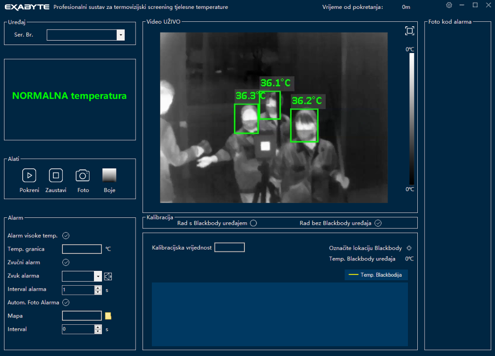 Naš software u realnom vremenu prikazuje infracrveni video prikaz;Naprednim algoritmima umjetne inteligencije software infracrveni real-time video neprekidno pretražuje za oblicima ljudske glave;Nakon prepoznavanja ljudske glave software u predjelu čela mjeri najtopliju točku;Kada utvrdi temperaturu čeonog predjela višu od podešene granične razine software može oglasiti zvuk kojim alarmira osoblje; Software može i pohraniti fotografiju situacije u trenutku kada se uključi alarm za previsoku temperaturu, radi prepoznavanja osobe kojoj je utvrđena previsoka temperature;Korisničko sučelje je na hrvatskom jeziku, vrlo je jednostavno, pregledno i jasno: sadrži samo potrebne informacije i najosnovnije parametre.