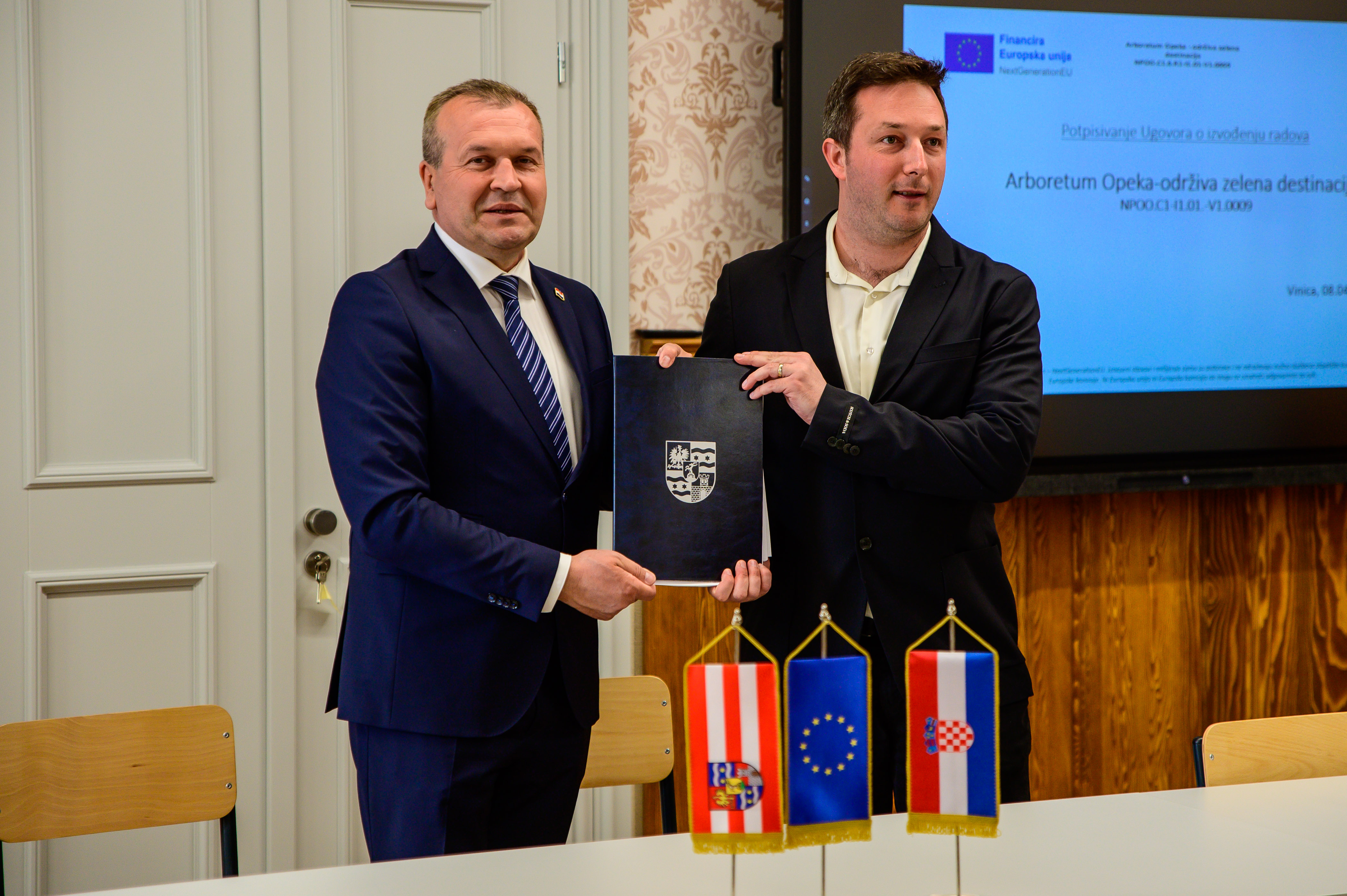 U sklopu provedbe projekta Arboretum Opeka - održiva zelena destinacija, danas je u Kongresnoj dvorani dvorca Opeka upriličeno potpisivanje Ugovora o izvođenju radova, a ugovor su potpisali župan Varaždinske županije Anđelko Stričak i direktor tvrtke Vodogradnja Mario Lacković. Potpisivanju ugovora nazočili su i načelnik Općine Vinica dr.sc. Branimir Štimec, županijski vijećnik i prvi župan Varaždinske županije dr.sc. Zvonimir Sabati, pročelnik Upravnog odjela za poljoprivredu i zaštitu okoliša dr.sc. Dragutin Vincek, Sanja Kopjar, ravnateljica Javne ustanove „Priroda Varaždinske županije“, direktor Turističke zajednice Varaždinske županije Goran Mališ, ravnatelj srednje Poljoprivredne i veterinarske škole „Arboretum Opeka“ Dragan Brkić, ravnateljica Osnovne škole Vinica Mirjana Jambriško te predstavnici medija.