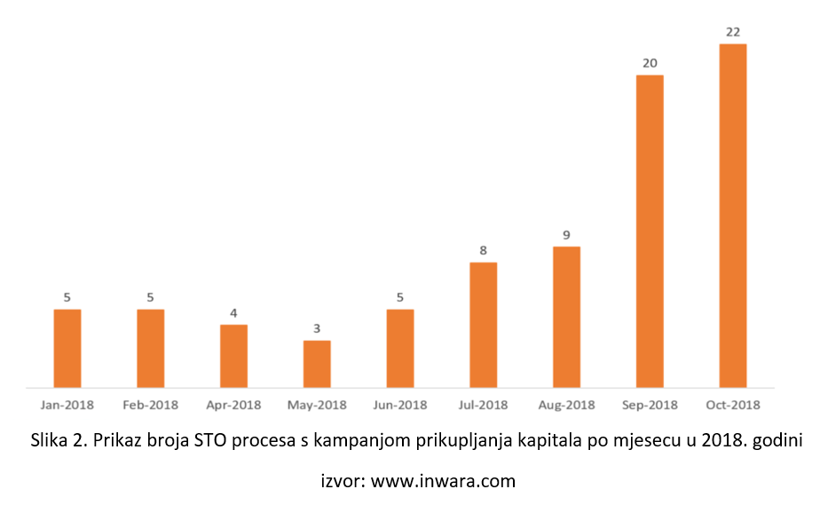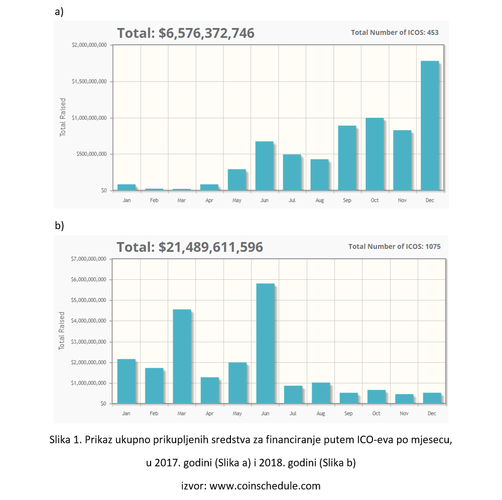 Uspoređujući prikupljena ICO sredstva 2017. i 2018. godine, zanimljiv je podatak da je u prvoj polovini 2018. godine prikupljeno više nego u cijeloj 2017. godini (Slika 1). Zatim u drugoj polovini 2018. godina bilježi se stagnacija i smanjenje u količini kapitala prikupljenog ICO-evima te broju projekata koji se odlučuju za ICO proces. Smanjenje broja ICO-eva osim što je posljedica dodatne opreznosti investitora, pad i neizvjesnost cijene bitcoina, a posljedično s time ostalih kriptovaluta, također su jedan od glavnih razloga proizašle situacije na tržištu kriptovaluta.