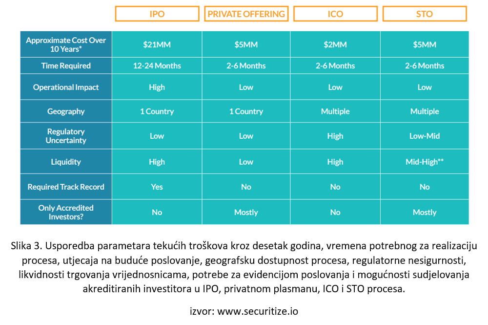 Bio to IPO, privatni plasman, STO ili čak ICO, koji se međusobno razlikuju po mnogobrojnim kriterijima, od početnih troškova i zadovoljavanja regulative procesa pa sve do likvidnosti kasnijih vrijednosnica, u svakom od tih slučajeva postoje tekući troškovi koji su također važan parametar za razmotriti (Slika 3.). Na slici 3 međusobno su uspoređeni neki od glavnih kriterija koji usmjeravaju kompanije pri traženju načina za prikupljanjem svježeg kapitala. Bitno je proučiti i uskladiti buduće namjere