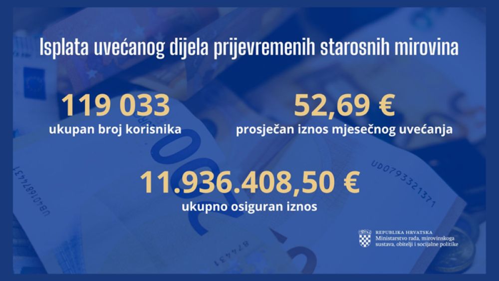 Bez umanjenja polaznog faktora mirovina je određena za ukupno 119.033 korisnika, a za tu je svrhu iz državnog proračuna osigurano 11.936.408,50 eura.