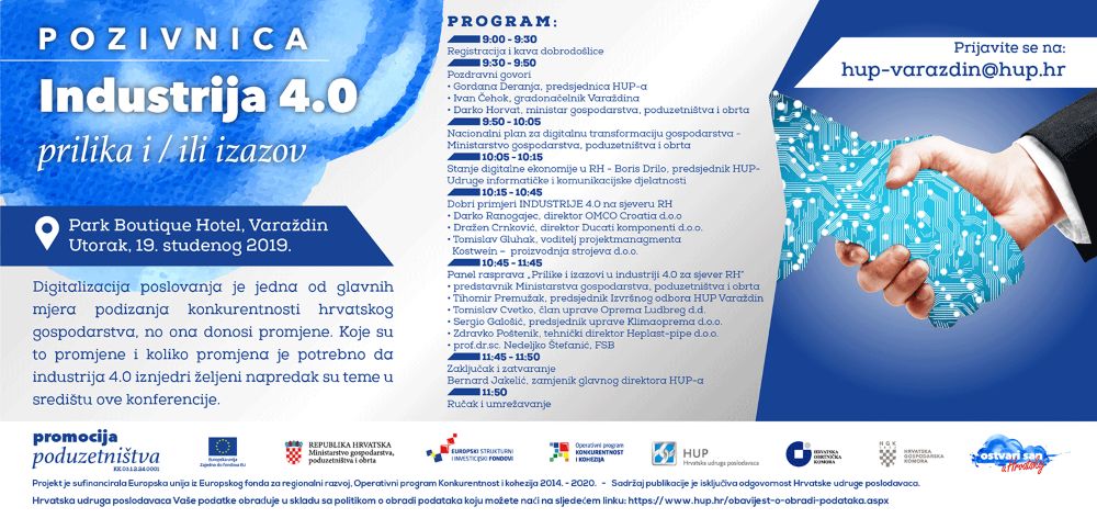 Na Konferenciji u Varaždinu: Industrija 4:0 – prilika i/ili izazov najuspješnije tvrtke varaždinske regije predstavit će po prvi put u javnosti svoje inovativne modele digitalne transformacije. Hrvatska udruga poslodavaca, kao partner u projektu „Promocija poduzetništva“ poziva vas na konferenciju „Industrija 4.0 – prilika i / ili izazov“ u Park Boutique hotelu u Varaždinu, 19. studenog 2019. s početkom u 9 sati. Na njoj će se okupiti više od 150 uzvanika -poslodavaca i institucija četiriju županija te će po prvi puta inovativne tvrtke sjevernih županija Hrvatske – Oprema Ludbreg d.d., Ducati komponenti d.o.o. i Kostwein – proizvodnja strojeva d.o.o. predstaviti vlastite uspješne primjere na svom putu digitalne transformacije.