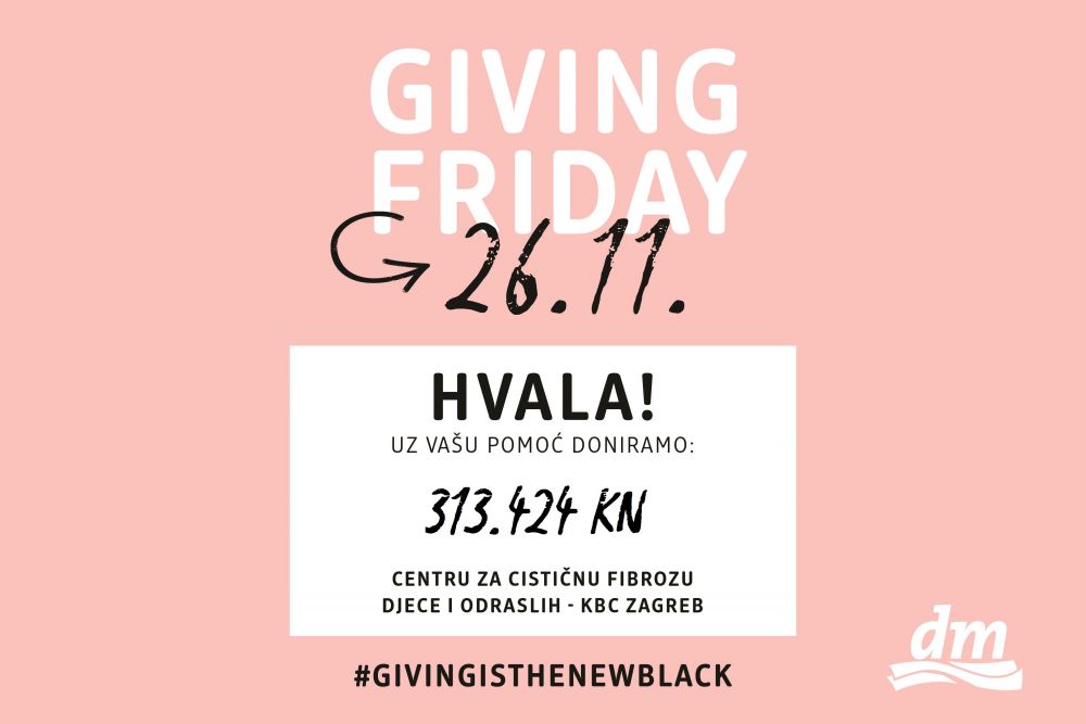 U petak, 26. studenog, dm je u sklopu Giving Fridaya, potpuno drugačije verzije Crnog petka, zahvaljujući podršci 71.056 kupaca, osigurao donaciju u iznosu od 313.424 kune. To je 5 posto ukupnog dnevnog prometa koji je dm ostvario na taj dan u 164 prodavaonice dm-a i u dm online shopu. Donacija je namijenjena Centru za cističnu fibrozu djece i odraslih KBC-a Zagreb, a osigurat će kvalitetnije liječenje uz nove medicinske uređaje, poput onog za čišćenje dišnih puteva te će oboljelima omogućiti lakši život s ovom neizlječivom bolesti.