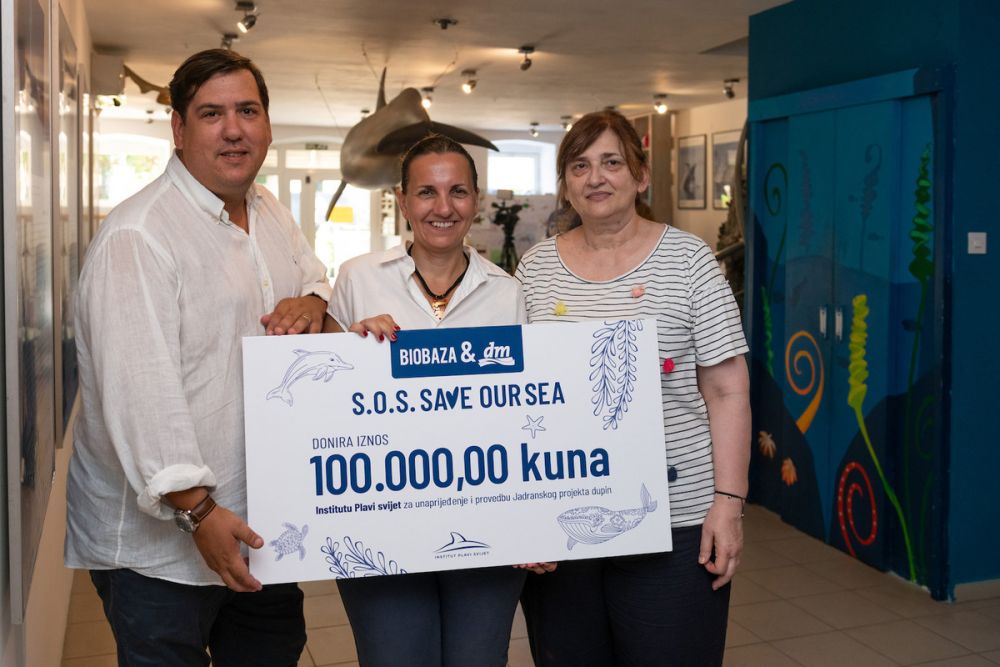 U Velom Lošinju uručena je donacija prirodne kozmetike Biobaza i dm-a u iznosu od sto tisuća kuna Institutu Plavi svijet. Sredstva su se prikupljala od lipnja u svim prodavaonicama dm-a prodajom limitirane kolekcije prirodne kozmetike Biobaza SOS Save our Sea, posebno osmišljene za ovu društveno odgovornu aktivnost i pakirane u održivu ambalažu. Cilj kampanje bio je podići svijest o zaštiti okoliša, smanjenju uporabe plastike i mikroplastike koja utječe na okoliš, a prije svega na morski svijet i životinje u Jadranu koje često stradaju od plastičnog otpada u moru. Kupnjom svakog proizvoda SOS Spasimo naše more, Biobaza i dm donirali su pet kuna za ovu hvalevrijednu aktivnost s ciljem unaprjeđenja i provedbe dugogodišnjeg projekta Jadranski dupin.