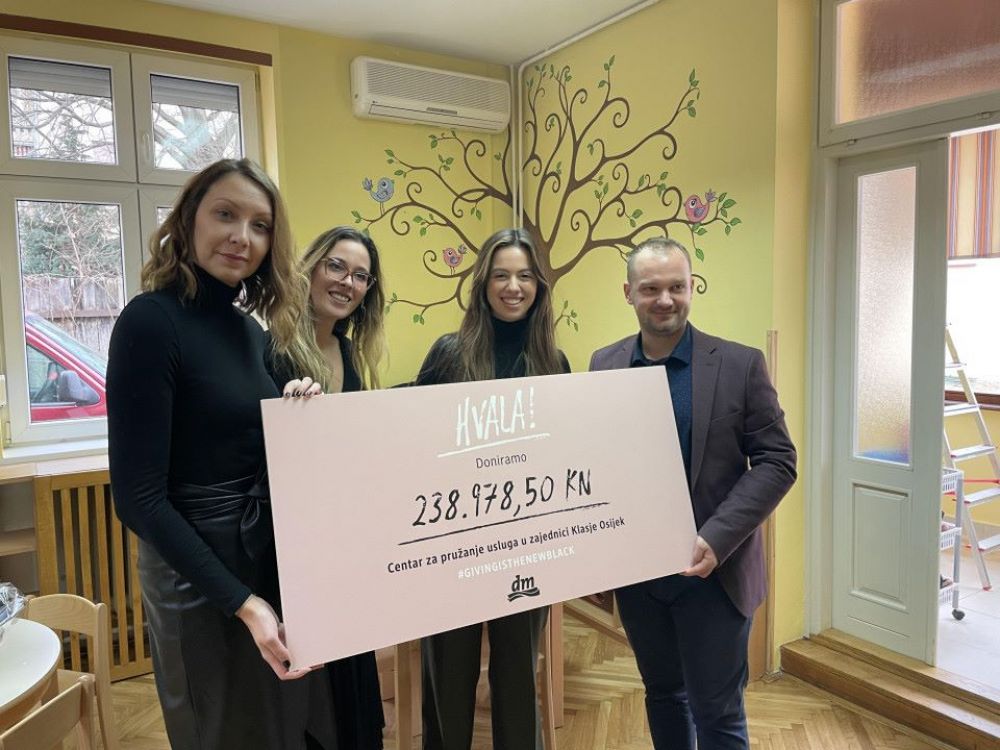 U četvrtak, dm je Centru za pružanje usluga u zajednici Klasje Osijek i Centru za pružanje usluga u zajednici Lipik predao donacije ukupne vrijednosti 477.957 kuna te prigodne božićne poklone svim korisnicima Centara. Sredstva su osigurana uz pomoć više od 90.000 kupaca dm-a iz cijele Hrvatske koji su odlučili sudjelovati u Giving Fridayu, potpuno drugačijoj verziji Crnog petka, povodom koje dm već pet godina za redom donira pet posto prometa ostvarenog na taj dan.