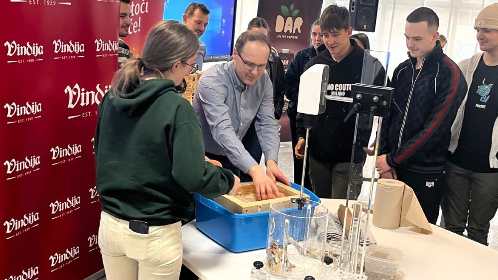 Druga u nizu, održana je i radionica naziva „Tetra Pak – Circularity and Recycling“, tijekom koje je gospodin Tomo Hunjak, zajedno s Vindijinim strateškim partnerom Tetra Pakom, demonstrirao mehaničku uporabu papira iz višeslojne kartonske ambalaže Tetra Pak. Interaktivna radionica omogućila je učenicima uvid u tehničke karakteristike ambalaže koja već dugi niz godina doprinosi očuvanju kvalitete proizvoda Grupe Vindija.