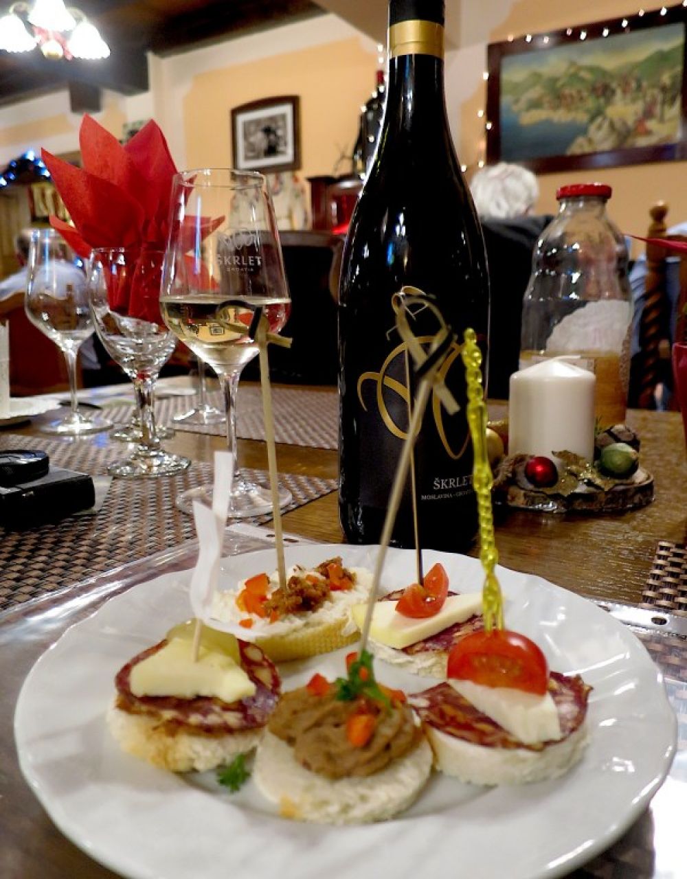 Osmišljeni kao nenametljivi, kanapei, ljupki otvoreni sendviči, od jednoga griza ili više njih, odlično su se sljubili s tim vinom. I prije smo ih imali na moslavačkom stolu, govori gospođa Snježana, no ovaj su put bili su namijenjeni za ovu posebnu prigodu.
