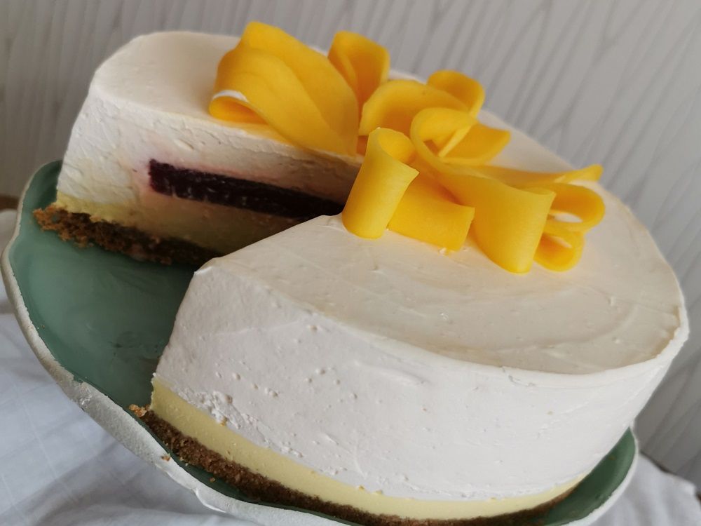 Smrznutu kremu od manga oprezno izvaditi iz kalupa i staviti je u sredinu većeg kalupa. Prazninu između smrznute kreme i stijenke kalupa popuniti kremom od sira pomoću vrećice za ukrašavanje, a njome prekriti i površinu, dakle potrošiti cijelu količinu. Poravnati površinu i staviti tortu na hlađenje minimalno 4 sata. Kad se torta stegne, oprezno je izvaditi iz kalupa i ukrasiti na trakice narezanim mangom.