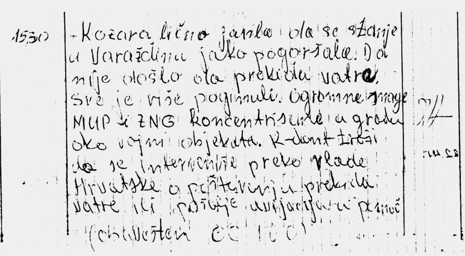 Iz Ratnog dnevnika 5. korpusa JNA, Banja Luka, vidimo da je zapovjedništvo 32. korpusa JNA (oznaka- Kozara) željelo s našom vladom odugovlačiti pregovore i izbjeći predaju ili da se jačim avionskim napadima prisile hrvatske snage na povlaćenje.