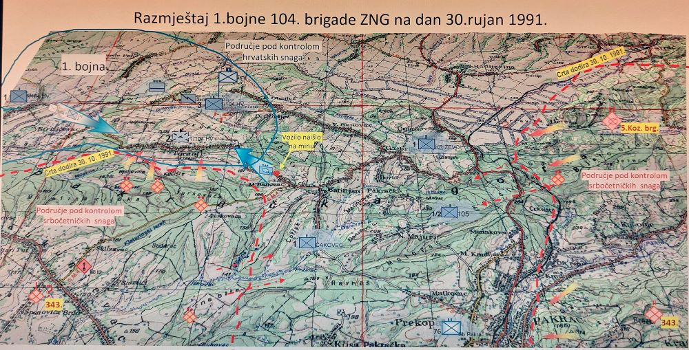 U jutarnjim satima u srijedu 30. listopada 1991. godine prvi mobilizirani pripadnici 1. bojne 104. brigade ZNG-a, okupili su se na zbornom mjestu u bivšoj vojarni JNA, danas studentski dom, koja se nalazila pored željezničkog kolodvora, kompletirali oružje i opremu, stali u stroj i nakon obraćanja zapovjednika bojne i satnija, ukrcali se u autobuse i kamione te u organiziranoj koloni krenuli prema zapadnoslavonskom bojištu[4].