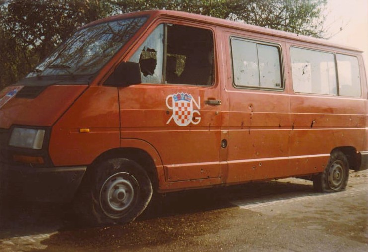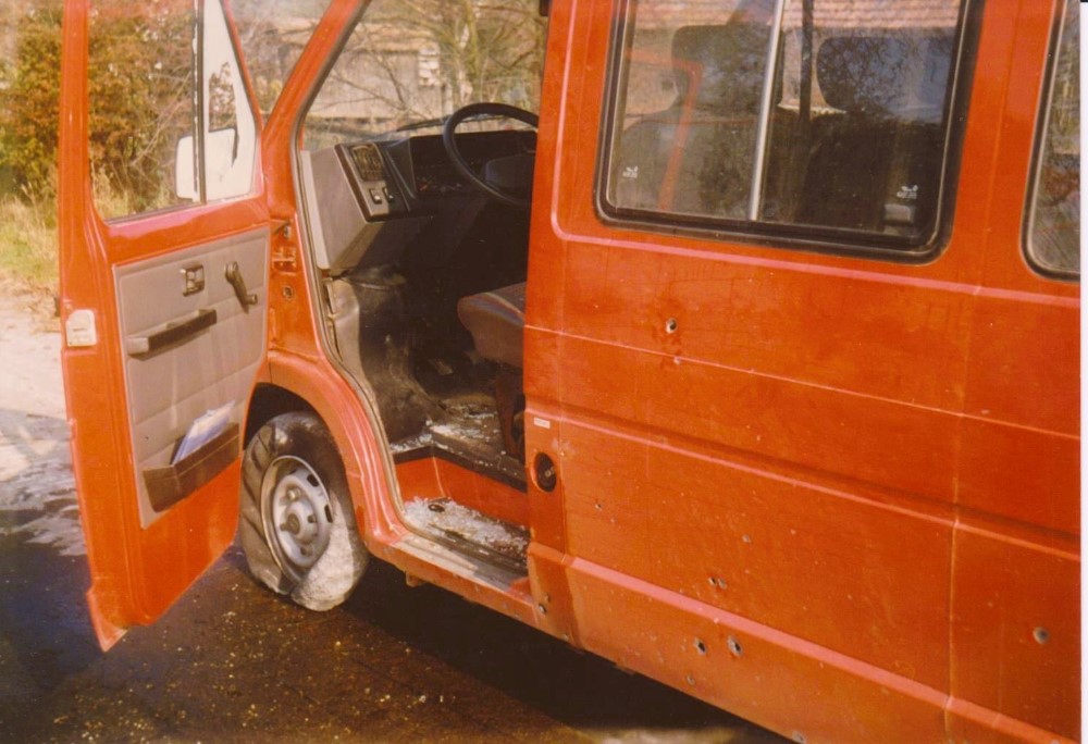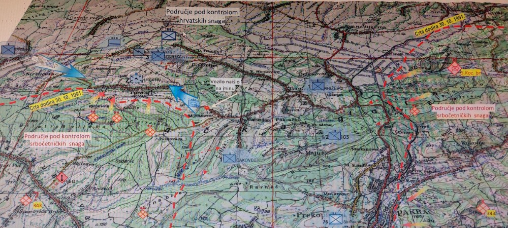 U kombiju su se prevozila minsko eksplozivna sredstva i streljivo, ja sam u osobnom vozilu bio iza u pratnji. Izlaskom iz sela Batinjani, budući da sam bio iza toga kombija, uočio sam da je, po mojoj prosudbi kombi pogođen nekakvim protuoklopnim sredstvom iz ovih šuma. Eksplozija je bila u lijevi bok vozila, vozilo se kompletno diglo, ja sam instinktivno stao na kočnicu i okrenuo se sa svojim vozilom bočno, istrčao van iz vozila i zauzeo položaj za obranu. Kombi, u kojem se nalazio bojnik Sokač i Vladimir Leskovar, se nekako uspio nastaviti kretati u pravcu Tornja. Kasnije, kad smo analizirali situaciju, shvatili smo da je kombi naletio na protutenkovsku minu. Međutim, budući da mina nije bila kompaktna, vjerojatno prilikom postavljanja, kombi je aktivirao samo jedan upaljač, koji je oštetio vozilo.“ (slika 10)