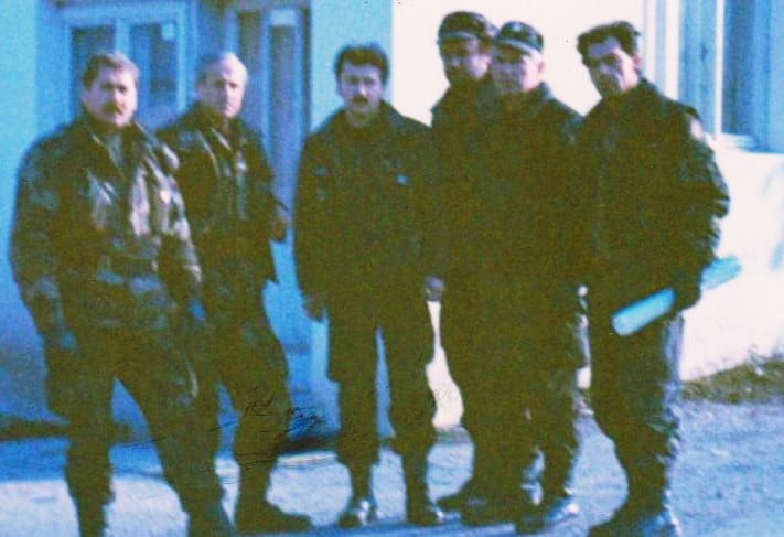 Slika 1. Zapovjednik 1. bojne sa suradnicima u zapovjedništvu obrane sektora Pakrac Slijeva: Vladimir Leskovar, referent tehničke službe, zapovjednik 1. varaždinske bojne Marijan Strelec, načelnik veze brigade Vladimir Svržnjak, referent tehničke službe Ivica Križanović, zamjenik zap. 104. brg. Ivan Sokač i referent teh. službe u 2. bojni Ivanec, Hraščanec Goran.