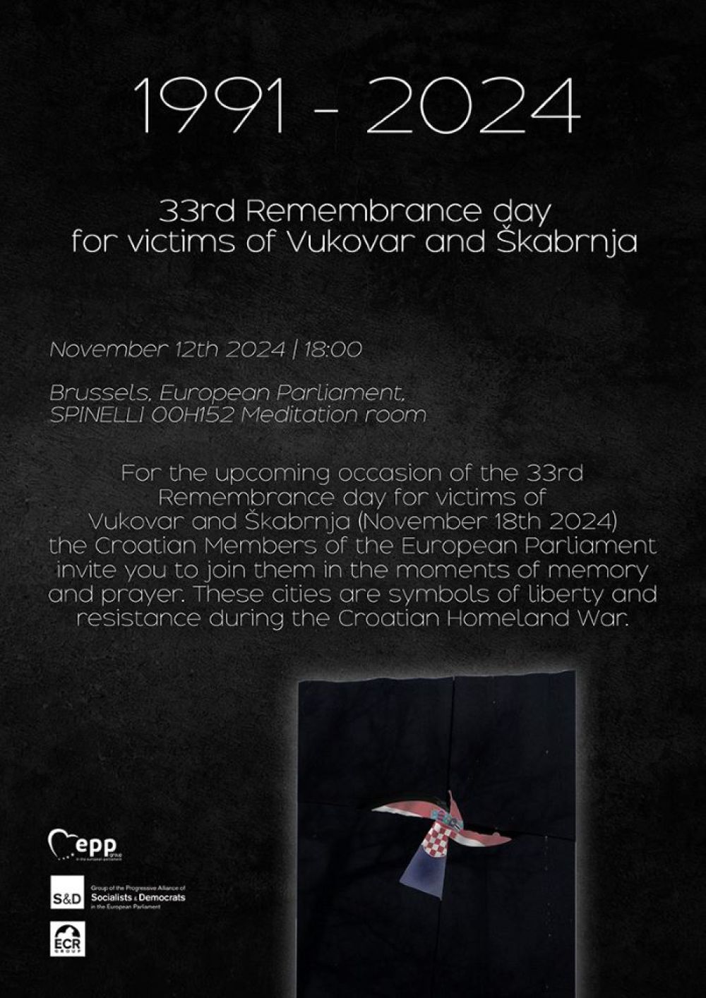 Uoči Dana sjećanja na žrtve Domovinskog rata i Dana sjećanja na žrtvu Vukovara i Škabrnje, u Europskom parlamentu u Bruxellesu (Spinelli 00H152 Meditacijska soba) u utorak, 12. studenoga, u 18 sati bit će služena Sveta Misa. Tom prigodom zastupnici u Europskom parlamentu pozivaju sve koji žele odati počast stradalima u Domovinskom ratu i žrtvi koju su Vukovar i Škabrnja podnijeli za slobodu i neovisnost Republike Hrvatske da im se pridruže u trenutcima sjećanja i molitve.