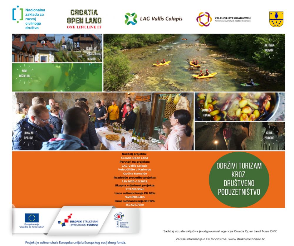 Domaća receptivna turistička agencija Croatia Open Land Tours DMC iz Karlovca prijavom na poziv za „Jačanje društvenog poduzetništva - faza I.“, 1. listopada ostvarila je potporu i započela provedbu projekta pod nazivom „Održivi turizam kroz društveno poduzetništvo“. Uz nadzor Ministarstva rada, mirovinskoga sustava, obitelji i socijalne politike projekt se provodi uz podršku Nacionalne zaklade za razvoj civilnoga društva. Ukupna vrijednost de minimis potpore iznosi 1.117.518,39kn financiranih iz Europskog socijalnog fonda. Iznos EU sufinanciranja je 85 posto odnosno 949.890,63 kuna, dok RH sudjeluje s 15 posto odnosno 167.627,76 kuna. Razdoblje provedbe projekta 19 mjeseci odnosno do 1.5.2022.