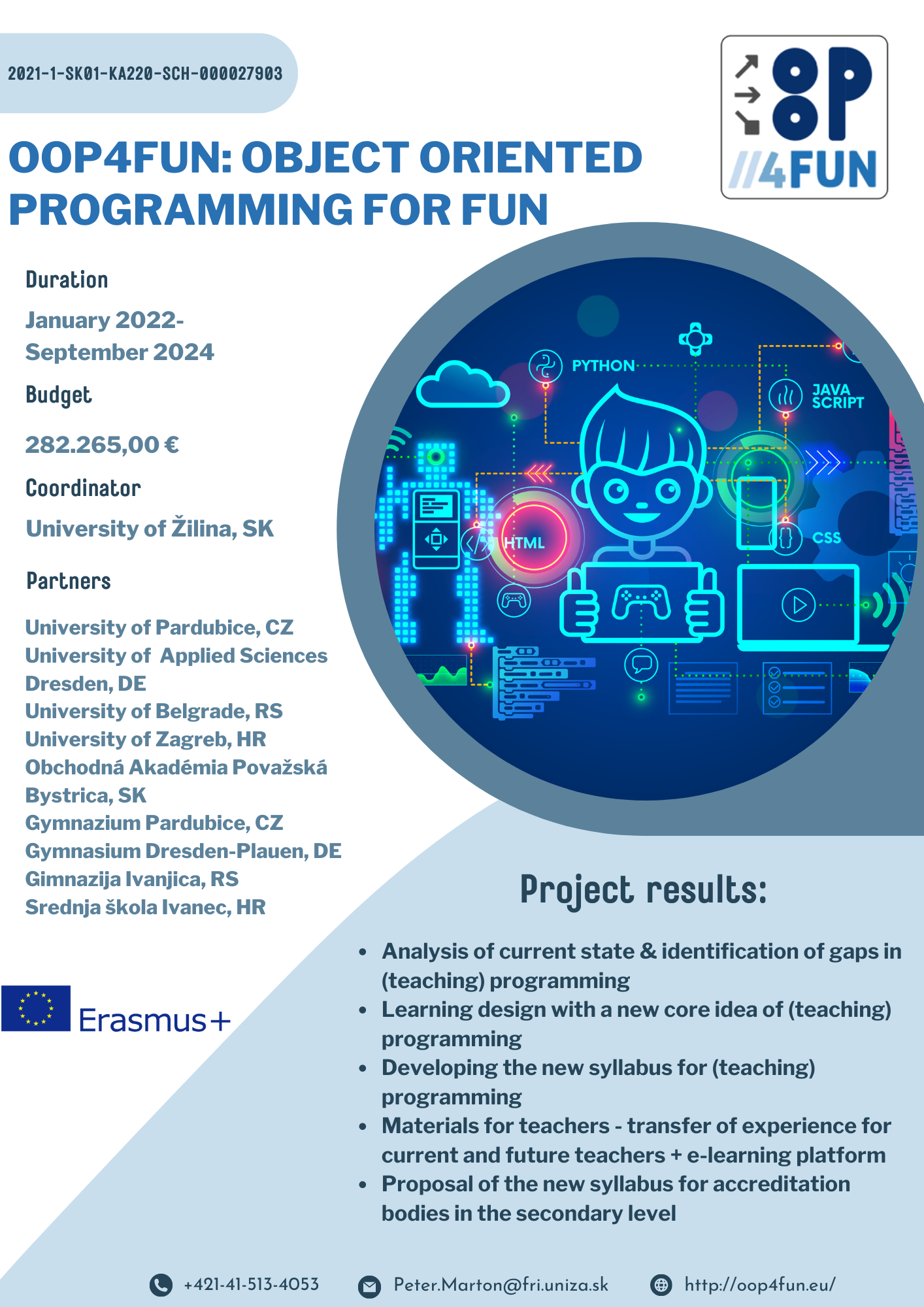 Ovaj projekt trajanja 32 mjeseca počeo je s provedbom 16. siječnja 2022. Godine i financiran je Erasmus+ programom “Cooperation partnerships in school education” u iznosu od 282.265,00 eura. Ciljevi projekta usmjereni su na nastavnike i učenike srednjih škola. Osnaživanje nastavnika u korištenju inovativnih kurikuluma i pristupa u nastavi programiranja, posebice OOP programiranja, na zabavan način razvoja igrica bolje će pripremiti i potaknuti srednjoškolce na upis na STEM fakultete te će promijeniti njihovu percepciju programiranja.