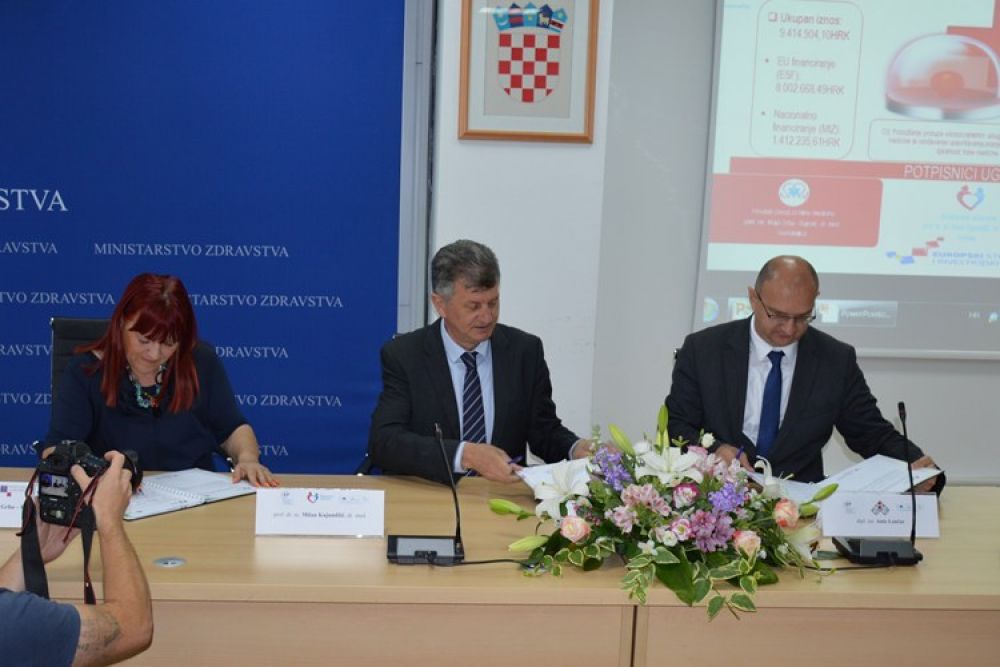 Ministar zdravstva Milan Kujundžić, ravnatelj Hrvatskog zavoda za zapošljavanje Ante Lončar i ravnateljica Hrvatskog zavoda za hitnu medicinu Maja Grba Bujević, potpisali su u ponedjeljak Ugovor o dodjeli bespovratnih sredstava iz Europskog socijalnog fonda projektu Hrvatskog zavoda za hitnu medicinu „Kontinuirano stručno osposobljavanje radnika u djelatnosti hitne medicine“ (UP.02.2.1.03.0001). Izravna dodjela bespovratnih sredstava u iznosu od 9.414.904,10 kuna osigurana je u okviru Operativnog programa „Učinkoviti ljudski potencijali“ za razdoblje 2014. - 2020. Kao čelnik Upravljačkog tijela Operativnog programa, potpisivanju je nazočio i ministar rada i mirovinskoga sustava Marko Pavić.