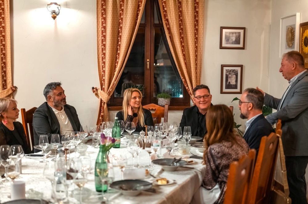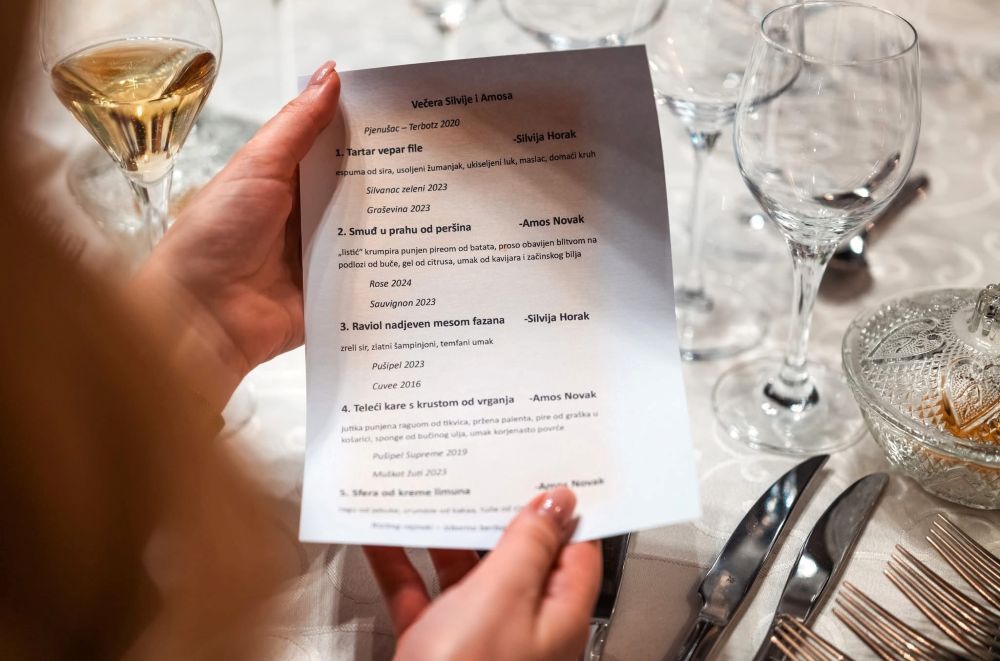 Chefovi Amos i Silvija pripremili su pet sljedova, a vinar i ugostitelj Branimir Jakopić sa sinovima i obitelji odabrali deset vina te stvorili pamtljiv ugođaj u kojem se večer odvijala, a sve okupljene u ležernom raspoloženju upoznavalo s dosezima kuhinje i novostima koje na gradilištu kuriju Zichy – Terbocz užurbano pretvaraju u hotel baština visoke kategorije s dopunom luksuznih sadržaja.