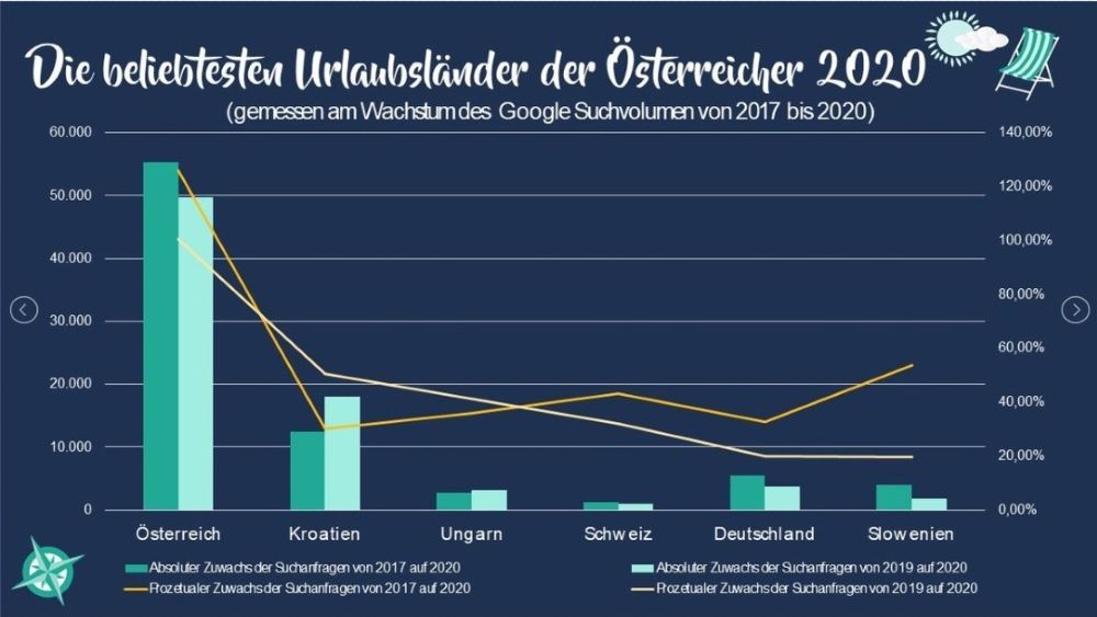 Prema rezultatima ovog istraživanja, u 2020. godini porastao je interes za putovanja u Hrvatsku, Njemačku, Austriju i Švicarsku, dok su pojedine i Hrvatskoj konkurentne zemlje ostvarile lošije rezultate. Naime, u cijeloj DACH regiji interes za Španjolskom i Italijom pao je za 10 posto, a samo u Austriji potražnja za Italijom, Francuskom, Nizozemskom, Švedskom i Norveškom pala je za više od 30 posto u odnosu na 2019. godinu.