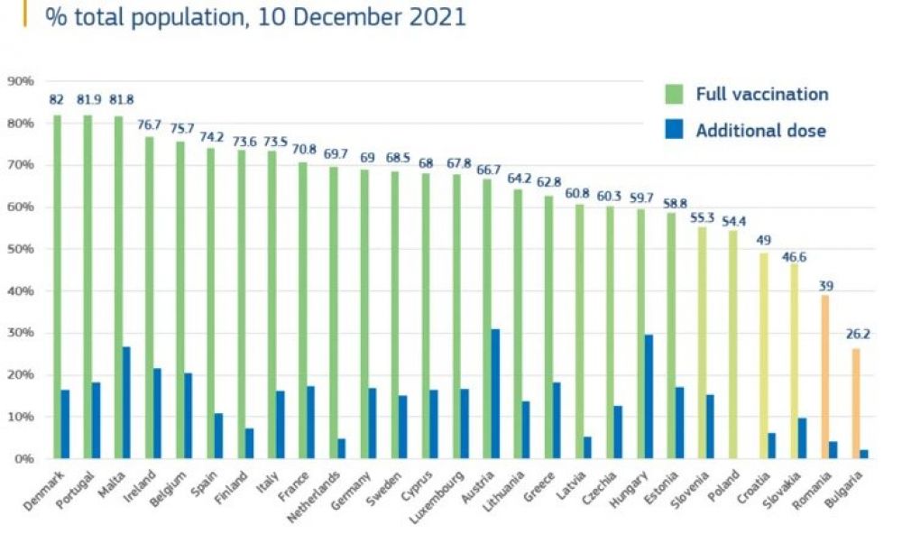 Europska komisija objavila je tablicu s podacima o broju cijepljenih građana u zemljama EU-a u odnosu na ukupan broj stanovnika te podatke o onima koji su primili dodatnu, tzv. booster dozu, prema stanju na dan 10. prosinca. Iz grafičkog prikaza vidljivo je da se Hrvatska nalazi na začelju prema oba kriterija.