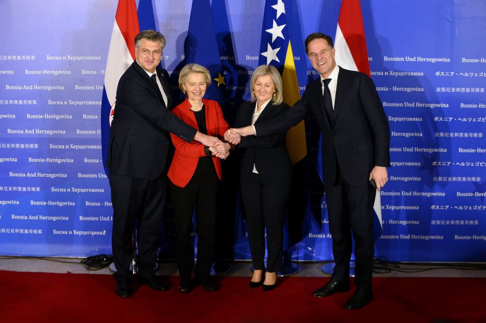Predsjednica Europske komisije Ursula von der Leyen te premijeri Hrvatske i Nizozemske Andrej Plenković i Mark Rutte poručili su u utorak u Sarajevu da Bosna i Hercegovina ima stvarnu priliku otvoriti pregovore o članstvu u Europskoj uniji, no provedba reformi i dalje ostaje preduvjet za to. "Ovo je povijesna prilika za BiH da uhvati korak s drugim zemljama na europskom putu, a pritom ima snažnu podršku Hrvatske", poručio je tom prigodom premijer Plenković.Bosna i Hercegovina je podnijela zahtjev za članstvo u EU u veljači 2016., a status kandidata za članstvo dobila je u prosincu 2022.
