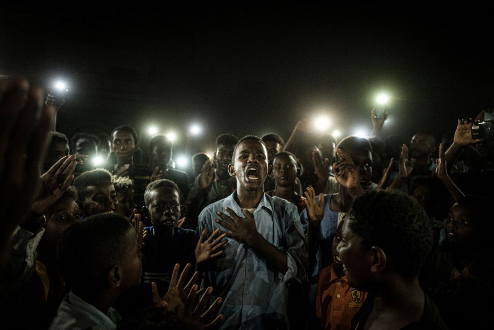 Fotografija „Straight Voice“ prikazuje scenu s jednog od tih prosvjeda koji je održan 19. lipnja 2019. Na njoj se vidi mladi aktivist koji recitira poeziju u trenutku nestanka struje − koji je namjerno izazvala vojska s ciljem gušenja prosvjeda − dok ga ostali prosvjednici iz mraka osvjetljavaju svojim mobitelima. U kolovozu te godine u Sudanu je konačno dogovorena uspostava nove prijelazne vlade.