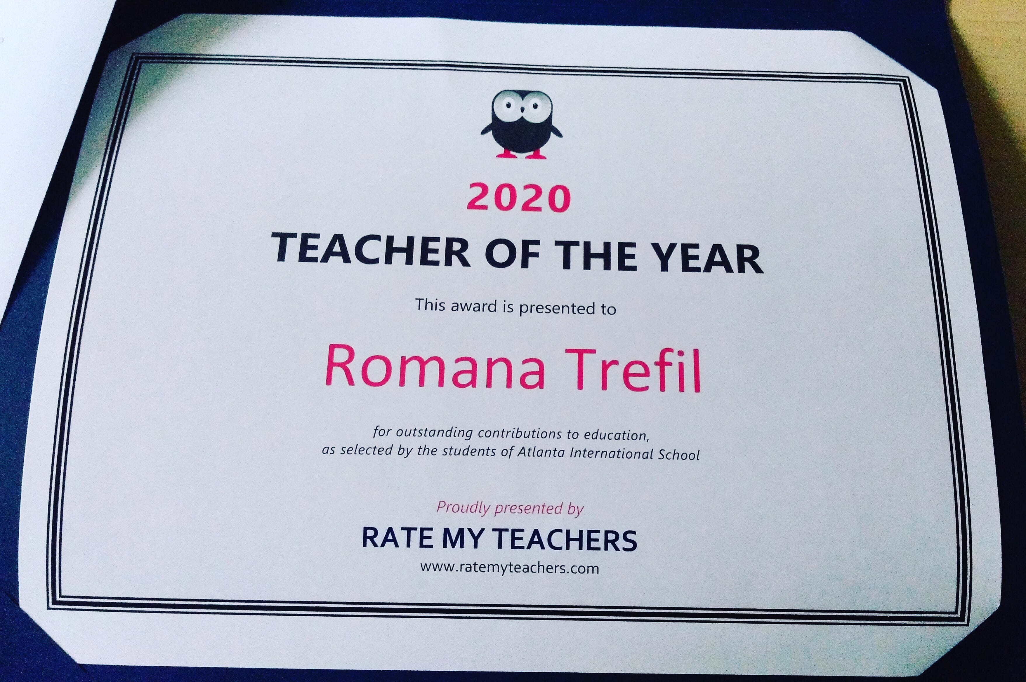 Dr. Romana Trefil, međunarodna nastavnica njemačkog jezika i pojedinaca & društva u Međunarodnoj školi Atlanta (International School of Atlanta), primila je Nagradu za nastavnika godine (Teacher of the Year Award) za 2020. godinu od web-organizacije Ocijeni moje učitelje (RMT). Dr. Trefil magistrirala je iz njemačke filologije i povijesti, a doktorirala iz njemačke filologije na Sveučilištu u Beču. Prije dolaska u Ameriku 2017. godine predavala je u školama u Njemačkoj, Austriji i Hrvatskoj.