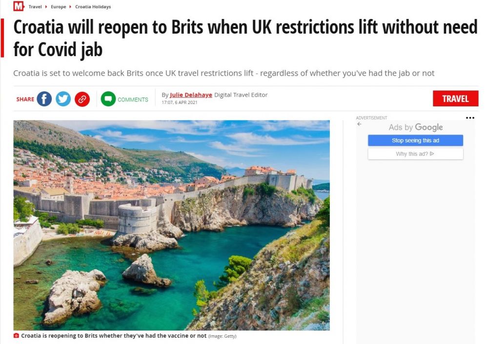 U članku se navodi kako bi Britanci uskoro mogli nesmetano putovati u Hrvatsku, ako ispune jedan od propisanih uvjeta, odnosno prilože dokaz o cijepljenju, negativnom PCR ili antigen testu ili potvrdu o oporavku od COVID-19 ne stariju od 180 dana. Uz to, u članku se navodi kako svi turisti prilikom ulaska u Hrvatsku moraju pokazati potvrdu rezerviranog smještaja i ispuniti online obrazac prije putovanja. Kako je naglašeno u tekstu, riječ je o novim pravilima prema kojima Hrvatsku mogu posjetiti i turisti iz zemalja koje nisu članice EU-a, a koja vrijede od 1. travnja.