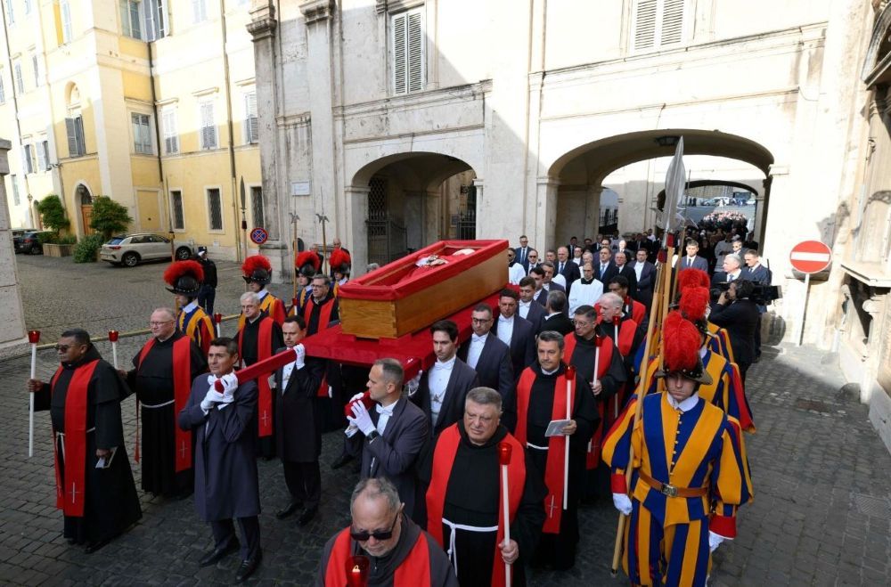 Lijes s tijelom pape Franje prenesen je jutros iz kapelice Doma svete Marte u baziliku sv. Petra u procesiji na čelu s Kardinalskim zborom koji se okupio u Rimu nakon njegove smrti. Kardinal Kevin Farrell, komornik Svete rimske crkve, započeo je liturgijski obred u kapelici Doma svete Marte kratko se pomolivši za dušu pape Franje, a u uvodnoj molitvi zahvalio je Bogu za 12-godišnju službu pokojnog Pape.