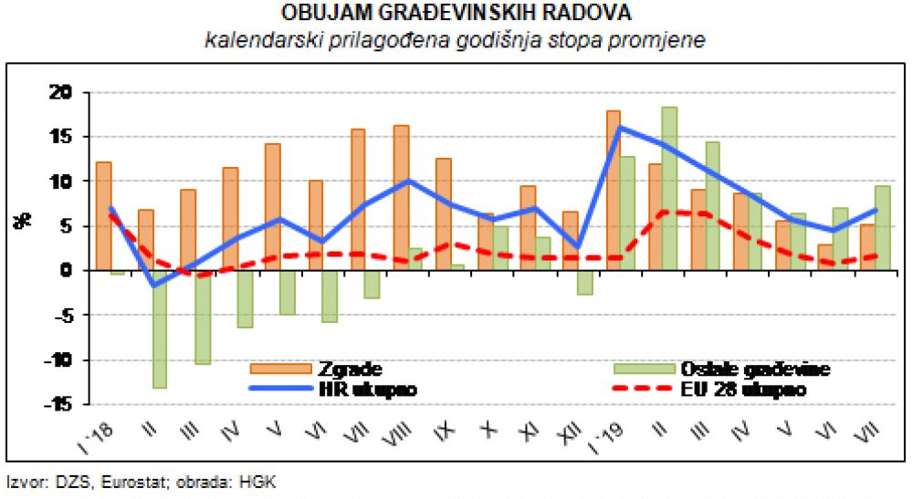 U srpnju je obujam građevinskih radova u odnosu na prethodni mjesec povećan za 4,1% (prema sezonski i kalendarski prilagođenim privremenim podatcima DZS-a) što je rezultiralo i nastavkom solidne dinamike rasta na godišnjoj razini od 6,9% (prema kalendarski prilagođenim podatcima). Riječ je o kontinuitetu rasta građevinske aktivnosti na godišnjoj razini koji, uz tri izuzetka, traje od početka 2016. godine, a dodatno je učvršćen od kolovoza prošle godine otkad se bilježi simultan rast obujma radova na zgradama i na ostalim građevinama. Štoviše, pri sve učinkovitijem korištenju raspoloživih sredstava iz fondova EU, od veljače ove godine jasno je izražena tendencija bržeg rasta obujma građevinskih radova u niskogradnji u odnosu na radove u visokogradnji. Tako su u srpnju ove godine, u odnosu na isti mjesec prošle godine, radovi na zgradama povećani za 5,2%, dok je istodobno obujam građevinskih radova na ostalim građevinama porastao za 9,4%. Iako je dinamika rasta građevinske aktivnosti u posljednjim mjesecima spuštena s dvoznamenkastih razina na kojima se kretala u prva tri mjeseca ove godine, ona je i dalje relativno visoka u odnosu na gospodarski rast i na rast koji se ostvaruje u drugim djelatnostima. Tako je u drugom kvartalu ove godine u odnosu na isto razdoblje prošle godine bruto dodana vrijednost građevinarstva povećana za 7,6% što je znatno više od rasta BDV-a ukupnog gospodarstva (2,4%) i više od rasta BDV-a svih ostalih djelatnosti.