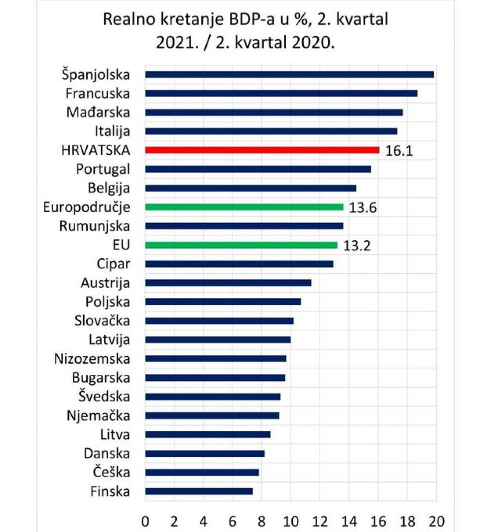 Hrvatska ovakvim kretanjima gospodarske aktivnosti u drugome kvartalu ima brži gospodarski rast nego prosjek EU-a, koji je 13,2%. Ako bismo promatrali prvu polovicu 2021. u odnosu na prvu polovicu 2020., Hrvatska bilježi rast BDP-a od 7,7%.