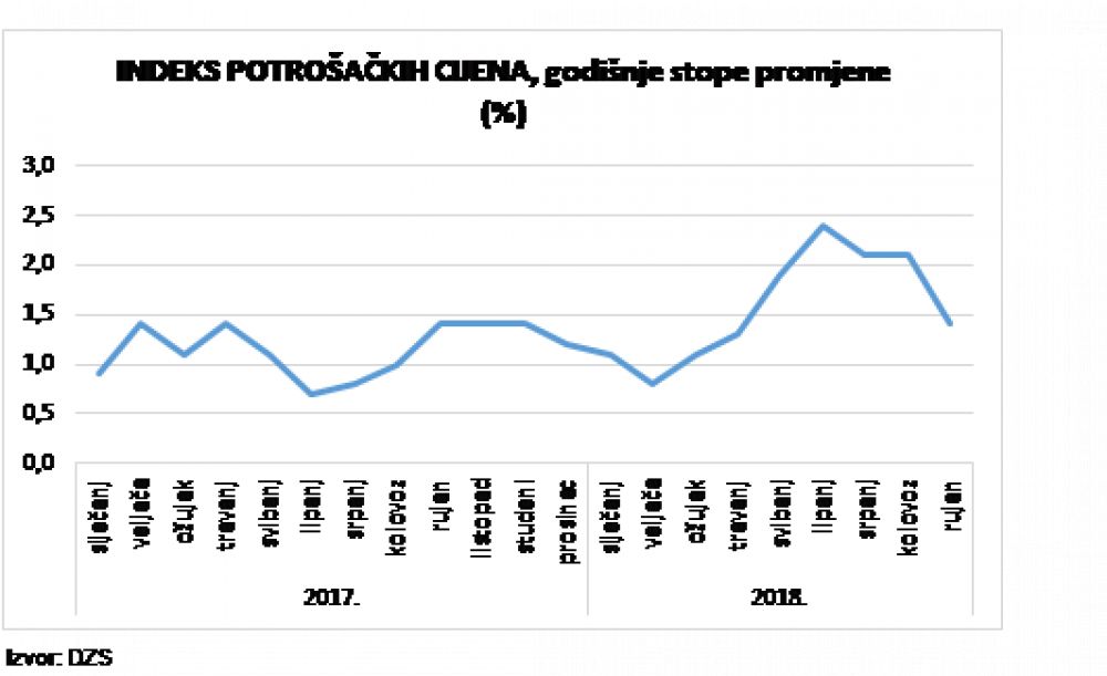 Godišnji je rast potrošačkih cijena u rujnu (1,4%) bio niži nego prethodnoga mjeseca te najniži od ovogodišnjega travnja. Kretanje inflacije ostaje vođeno cijenama roba koje su volatilne i podložne šokovima, odnosno cijenama hrane i energije.