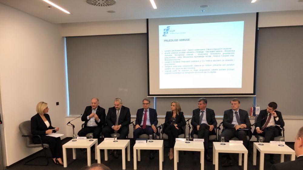 Uvodno izlaganje održala je Jadranka Primorac, predsjednica HUP- Udruge privatnih poliklinika, bolnica, lječilišta i ustanova za zdravstvenu skrb u kojem je predstavila analizu koju je HUP proveo u suradnji s Bisnodeom o statusu privatnog zdravstvenog sustava u RH od 2014. do 2017. Održivost zdravstvenog sustava u vremenu brzog razvoja tehnologija, produženja životnog vijeka i drugih faktora ovisit će uvelike o sinergiji privatnog i zdravstvog sustava. Privatne zdravstvene ustanove imaju kontinuiran rast prihoda od 1,8 mlrd kuna u 2013. do 5 mlrd. kuna koliko se očekuje u 2018. godini. Ukupan broj privatnih zdravstvenih ustanova u 2017. iznosio je 1239 ustanova. Također, imali su i kontinuirani rast broja zaposlenih u promatranim godinama s 5859 u 2014. godini na 7548 zaposlenih u 2017. U posljednje tri godine zabilježen je i značajan porast investicija u ovom sektoru – sa 100 na 300 milijuna kuna. Privatne zdravstvene ustanove imaju multiplikativan utjecaj na sve sfere gospodarstva s time što privlače značajan broj turista, a također ove ustanove zapošljavaju velik broj visokoplaćenih profesionalaca i zadržavaju te visokoobrazovane i stručne kadrove u zemlji.