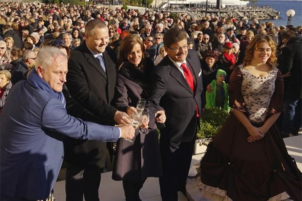 Tisuće gostiju sudjelovale su utorak u podne na tradicionalnoj novogodišnjoj zdravici na terasi hotela "Kvarner", uz nastup Puhačkog orkestra Lovran i prigodne čestitke na devet jezika. Svi su nazdravili pjenušcem iz čaša s ugraviranim poznatim opatijskim motivom - Djevojkom s galebom. Čaše su darovane gostima, kao jedinstveni suvenir i sjećanje na novogodišnji provod u Opatiji. Nakon zdravice druženje je nastavljeno ispred Umjetničkog paviljona Juraj Šporer uz In Between Band.