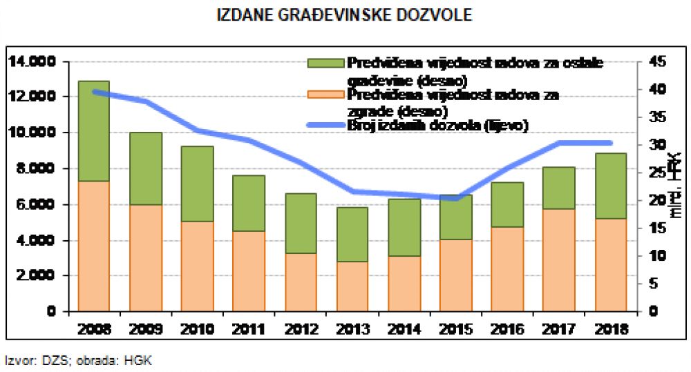 Unatoč višegodišnjim pozitivnim pomacima u kretanju građevinskih dozvola, osobito kod predviđene vrijednosti radova, pretkrizne vrijednosti dosegnute su samo kod broja izdanih građevinskih dozvola za ostale građevine. Svi drugi važni pokazatelji iz izdanih građevinskih dozvola nalaze se i dalje znatno ispod pretkrizne razine, pa je tako ukupan broj izdanih građevinskih dozvola u 2018. godini bio 23,4% manji nego u 2008. godini, broj izdanih dozvola za zgrade bio je 28,4% manji, broj dozvola za stanove manji je 52,3%, dok je istodobno predviđena vrijednost radova bila 31,3% manja (28,3% manja kod zgrada i 35,3% manja kod ostalih građevina). To upućuje na činjenicu da prostor za daljnji rast izdavanja građevinskih dozvola nije iscrpljen, osobito jer se predviđa nastavak rasta gospodarstva i investicijske aktivnosti velikim dijelom oslonjene na učinkovitije korištenje raspoloživih sredstava iz fondova EU.
