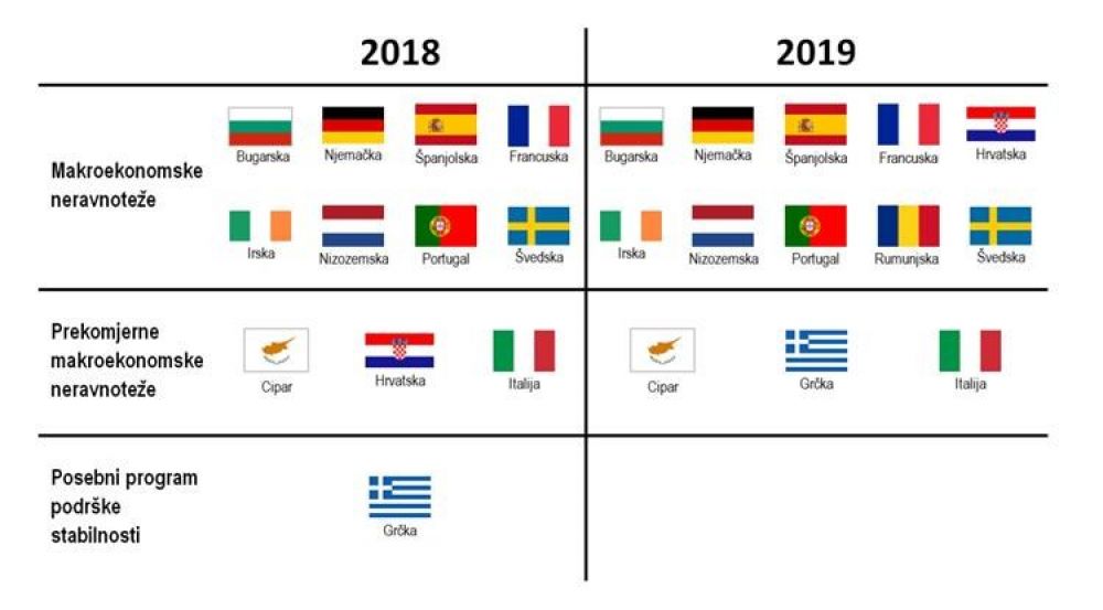 Prekomjerne makroekonomske neravnoteže. Postupkom u slučaju makroekonomske neravnoteže nastoji se utvrditi, spriječiti i ukloniti potencijalno štetne makroekonomske neravnoteže koje bi mogle negativno utjecati na gospodarsku stabilnost u određenoj zemlji EU-a, u europodručju ili u EU-u u cjelini. Makroekonomske neravnoteže u jednoj zemlji EU-a, primjerice veliki manjak tekućeg računa ili balon na tržištu nekretnina, mogu štetno utjecati na druge države članice EU-a. To se pokazalo tijekom globalne financijske krize. Zbog toga je 2011. uveden postupak u slučaju makroekonomske neravnoteže. Njime se omogućuje pojačani nadzor zemalja u kojima su utvrđene prekomjerne neravnoteže u okviru postupka u slučaju prekomjerne neravnoteže. Prekomjerni proračunski manjak ili Procedura prekomjernog proračunskog deficita (eng. Excessive deficit procedure, EDP) postupak je predviđen Ugovorom o Europskoj uniji, kasnije je još detaljnije obrađen u Paktu o stabilnosti i rastu, a odnosi se na mjere koje Europska unija poduzima prema državama članicama čije javne financije nisu u skladu s pravilima koja se odnose na veličinu proračunskog manjka i javnog duga. Europski semestar. Europski semestar ciklus je usklađivanja gospodarskih i poreznih politika u Europskoj uniji. Odvija se u prvih šest mjeseci u godini, zbog čega je i dobio naziv „semestar“. Europski semestar dio je šire reforme gospodarskog upravljanja Europskom unijom. Cilj europskog semestra jest uskladiti gospodarske i proračunske politike država članica kako bi se pridonijelo stabilnosti Europske unije, zajamčila stabilnost javnih financija država članica, potaknuo gospodarski rast te spriječile prekomjerne makroekonomske neravnoteže u EU-u. Europski semestar pokrenut je 2011. godine radi smanjenja utjecaja gospodarske krize i poticanja gospodarskog rasta u Europskoj uniji.