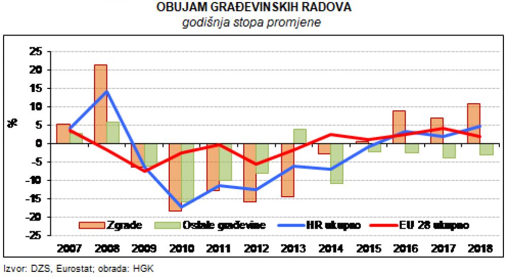 Unatoč rastu koji je prisutan posljednjih godina, razine građevinske aktivnosti u EU 28 i u Hrvatskoj i dalje su niže od onih iz pretkrizne 2008. godine za 5,7%, odnosno 42,3%. Pritom je 12 europskih zemalja doseglo ili prešlo pretkriznu razinu, dok se prema tom pokazatelju u lošijoj situaciji od Hrvatske nalaze samo Grčka, Portugal i Slovenija. Ohrabruje činjenica da je u prošloj godini rast građevinske aktivnosti u Hrvatskoj nadmašio prosječan rast ostvaren u EU te da se kontinuitet višeg rasta održava u posljednjih deset mjeseci.