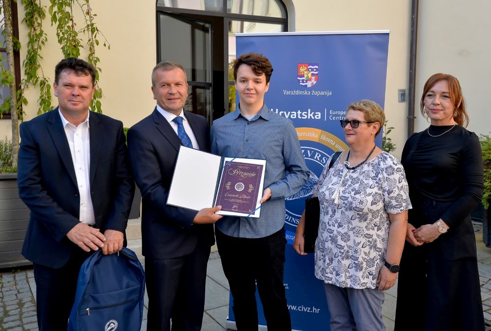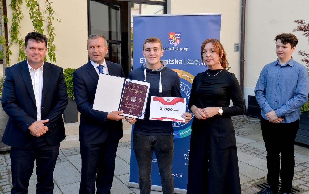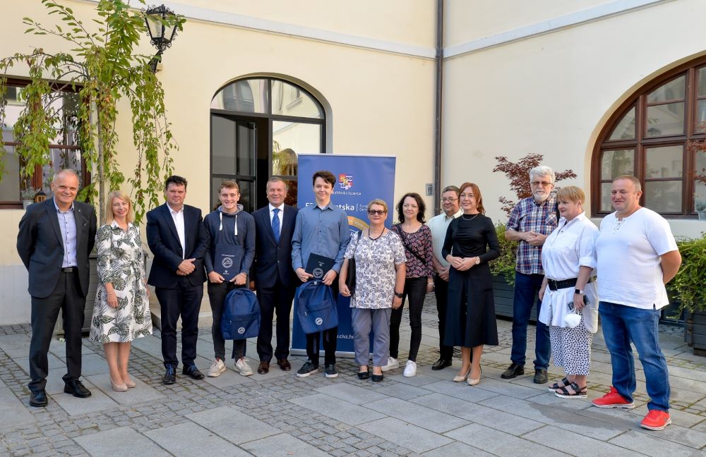 Župan Anđelko Stričak danas je na prijemu u atriju Županijske palače uručio priznanja te nagrade učenicima Juraju Kolariću i Emanuelu Takaču za postignute izvrsne rezultate na međunarodnim natjecanjima. Za osvojenu srebrnu medalju u području robotike Juraju je dodijeljena novčane nagrada 3.000 kuna, a Emanuelu 2.000 kuna za brončanu medalju iz matematike.