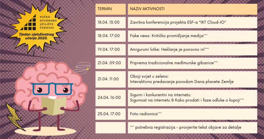 Bez obzira jeste li zainteresirani za nadograđivanje Vaših znanja ili jednostavno želite naučiti nešto novo, naše aktivnosti unutar Tjedna cjeloživotnog obrazovanja nude ponešto za svakoga! Stoga nemojte zaboraviti pozvati svoje ukućane, prijatelje i kolege s posla na aktivnosti koje organiziramo.