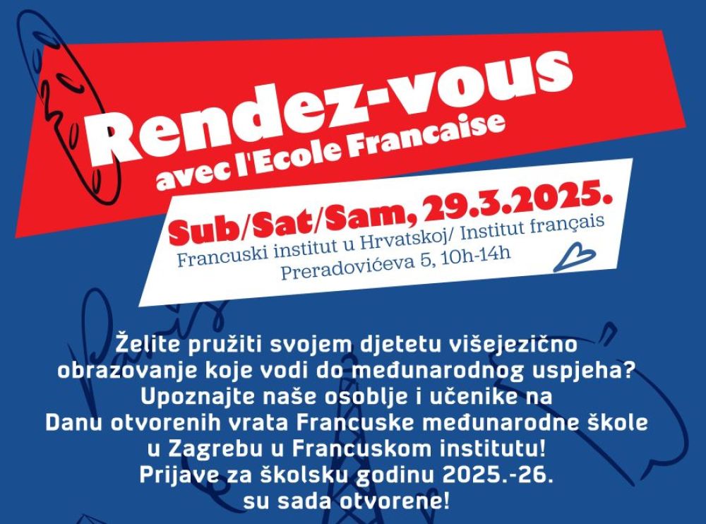 Francuska međunarodna škola u Zagrebu (EFIZ) ove subote, 29. ožujka pruža posebnu priliku roditeljima, učenicima i svim zainteresiranima da iz prve ruke upoznaju školu. Posjetitelji mogu saznati više o njezinim programima, upoznati nastavnike, roditelje i djecu škole te doživjeti atmosferu te multikulturalne ustanove u prostorijama Francuskog instituta u Hrvatskoj.