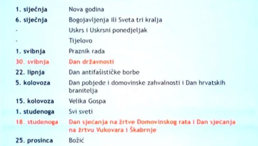 Što se tiče promjene blagdana, spomendana i neradnih dana, Plenković je predstavio prijedlog izmjena. Tako će Dan državnosti ponovno biti 30. svibnja, više to neće biti 25. lipnja. 18. studeni postaje Dan sjećanja na žrtve Domovinskog rata i Dan sjećanja na žrtvu Vukovara i Škabrnje. Dan neovisnosti 8. listopada više neće biti blagdan.