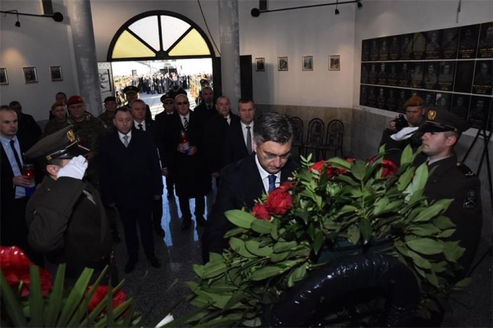 Zajednički vijenac položili su premijer Plenković, izaslanik predsjednice Republike Ante Deur, izaslanik predsjednika Sabora zastupnik Anđelko Stričak, s ministrima branitelja Tomom Medvedom i gospodarstva Darkom Horvatom te državnim tajnikom u Ministarstvu obrane Zdravkom Jakopom.