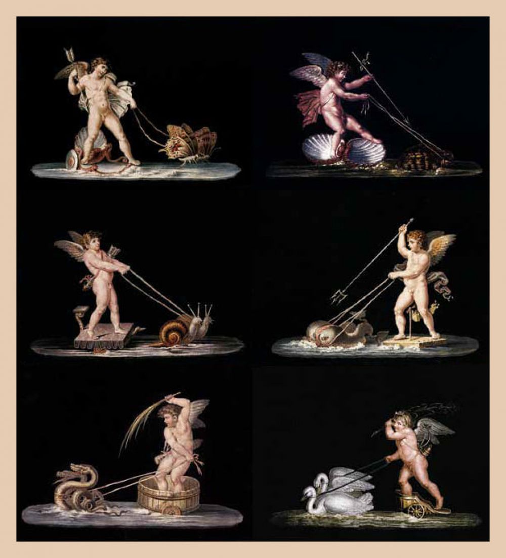 "Seriju od šest puniciranih bakroreza, naknadno koloriranih temperom, s prikazom boga ljubavi Amora u liku krilatog nagog dječaka sa životinjskim simbolima izradio je 1802. godine u Parizu francuski grafičar Pierre Charles Coqueret prema predlošku Michelangela Maestrija.