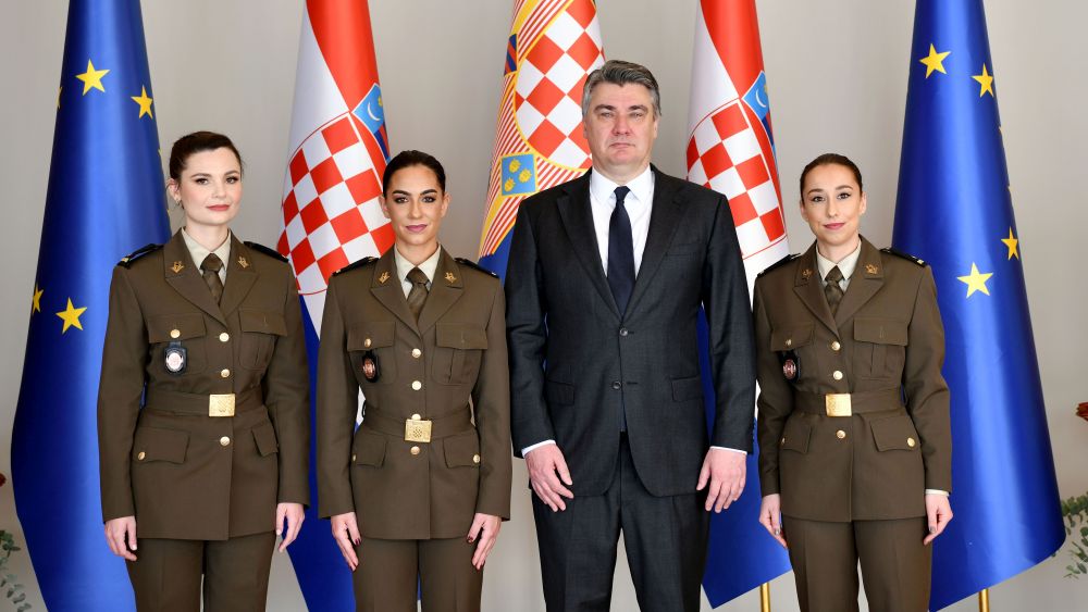 Predsjednik Republike Hrvatske i vrhovni zapovjednik Oružanih snaga Republike Hrvatske Zoran Milanović uručio je danas na svečanosti u Uredu predsjednika Republike časničke činove polaznicama 13. naraštaja temeljne časničke izobrazbe – smjer Zdravstvena služba, poručnicama Silviji Jelačić, Antei Klobučar i Sari Milec.