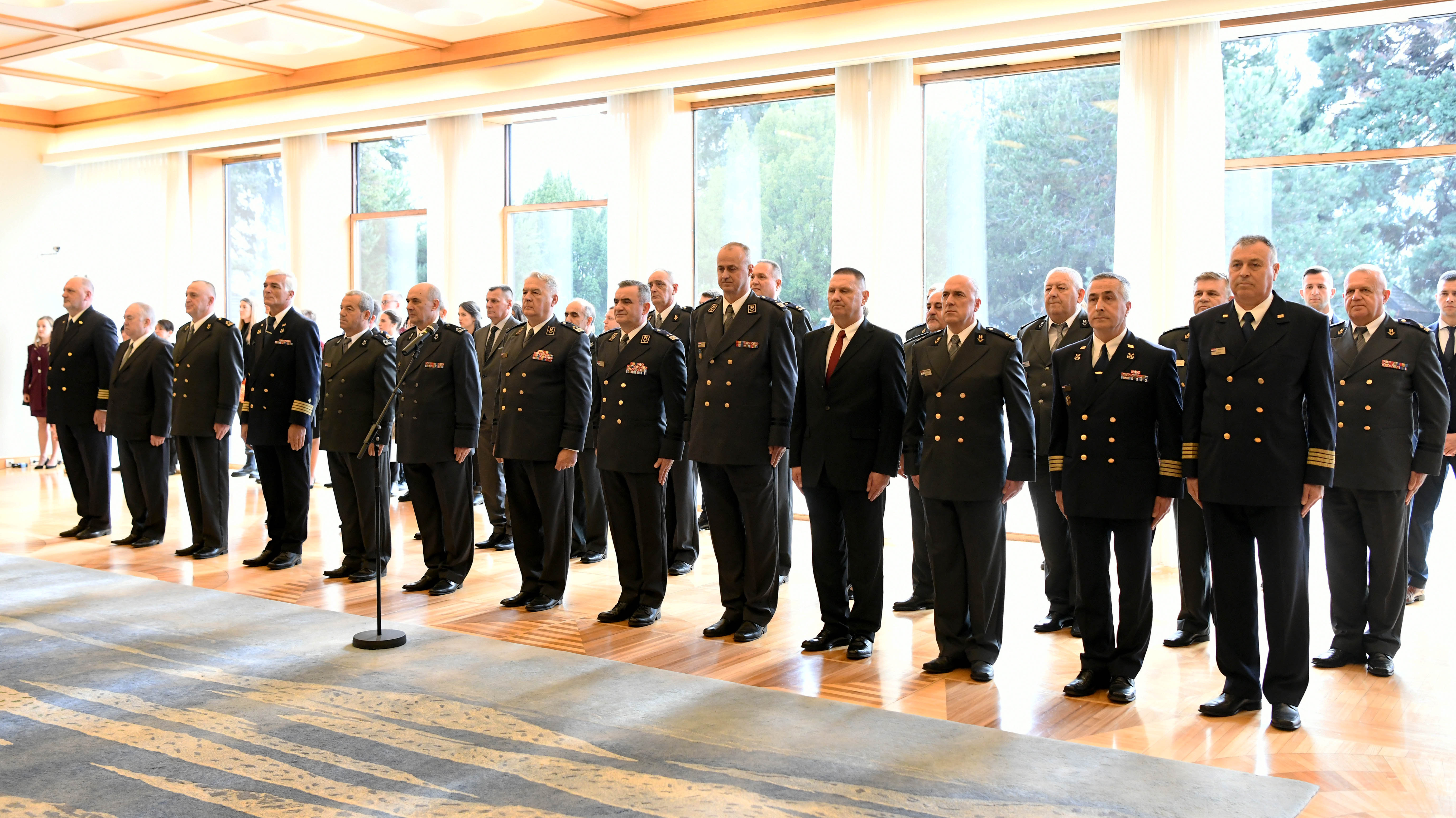 Uz umirovljene djelatnike i članove njihovih obitelji, na svečanom prijemu prisustvovao je načelnik Glavnog stožera OS RH admiral Rober Hranj sa suradnicima te generalni vikar Vojnog ordinarija don Marko Medo. U Uredu predsjednika Republike bili su zapovjednik Hrvatske kopnene vojske general pukovnik Boris Šerić, zapovjednik Zapovjedništva za potporu general pukovnik Mladen Fuzul, zapovjednik Hrvatske ratne mornarice kontraadmiral Ivo Raffanelli, zapovjednik Hrvatskog ratnog zrakoplovstva brigadni general Michael Križanec, zamjenik zapovjednika HVU „Dr. Franjo Tuđman“ brigadni general Blaž Beretin, načelnik Personalne uprave GS OSRH brigadni general Ivan Zelić, načelnik Uprave za KIS GS OSRH brigadni general Ante Tolić, zapovjednik Zapovjedno operativnog središta brigadni general Ivan Turkalj, načelnik Obavještajne uprave GS OSRH brigadni general Mijo Validžić, zapovjednik Zapovjedništva specijalnih snaga brigadir Ivan Miloš, zamjenik načelnika Operativne uprave GS OSRH brigadir Mate Gudelj i pobočnik načelnika GS OSRH satnik Tomislav Vučak.