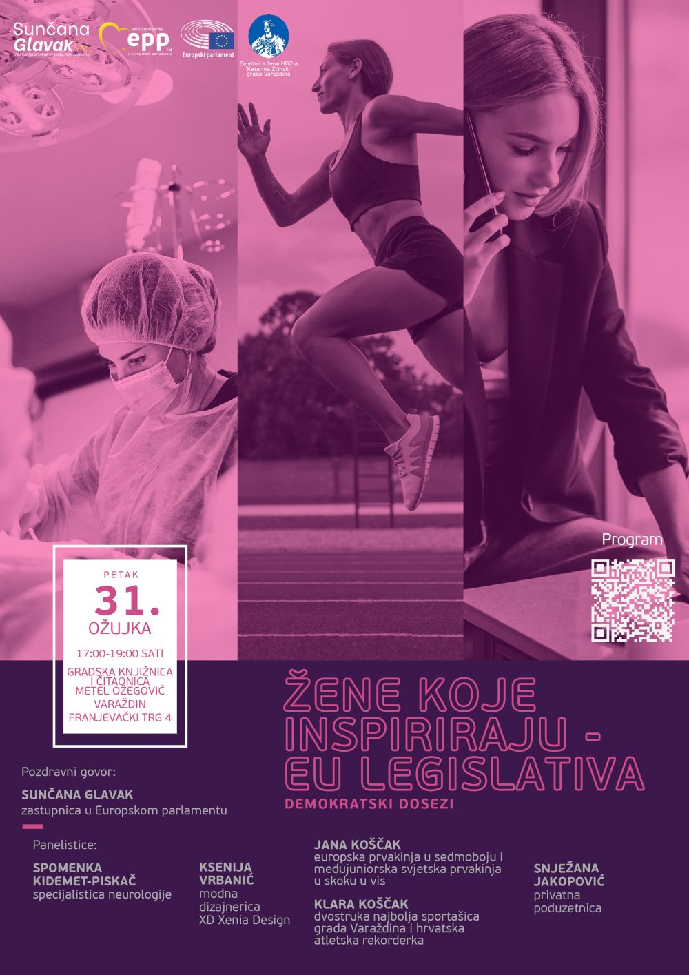Zastupnica u Europskom parlamentu Sunčana Glavak u suradnji sa Zajednicom žena HDZ-a Katarina Zrinski grada Varaždina organizira konferenciju “Žene koje inspiriraju – EU legislativa” koja će se održati u Varaždinu (Gradska knjižnica i čitaonica Metel Ožegović, Franjevački trg 4), u petak, 31. ožujka 2023., s početkom u 17 sati.