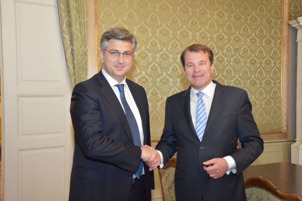 Predsjednik Vlade Andrej Plenković primio je danas u Banskim dvorima glavnog izvršnog direktora i prvog potpredsjednika Europske banke za obnovu i razvoj (EBRD) Jürgena Rigterinka, rukovodeću direktoricu Odjela Europske banke za obnovu i razvoj za srednju i jugoistočnu Europu Charlotte Ruhe te regionalnu direktoricu Europske banke za obnovu i razvoj za Hrvatsku, Sloveniju, Mađarsku i Slovačku Vedranu Jelušić Kašić.