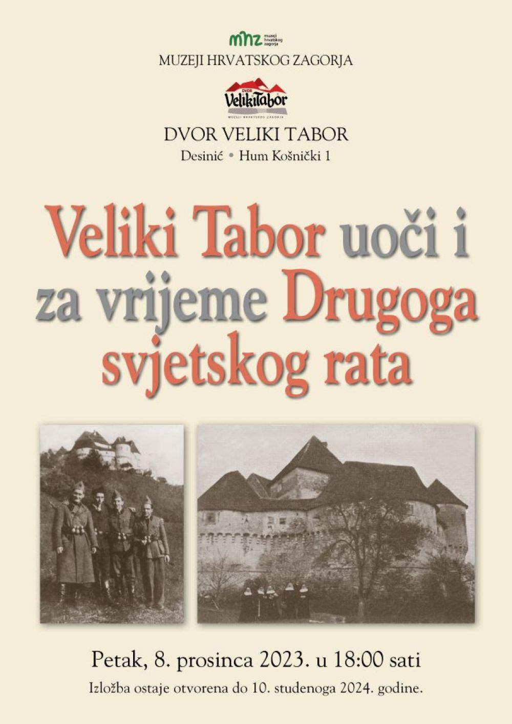 U petak, 8. prosinca, s početkom u 18 sati, u Dvoru Veliki Tabor održat će se otvorenje izložbe „Veliki Tabor uoči i za vrijeme Drugoga svjetskog rata“.