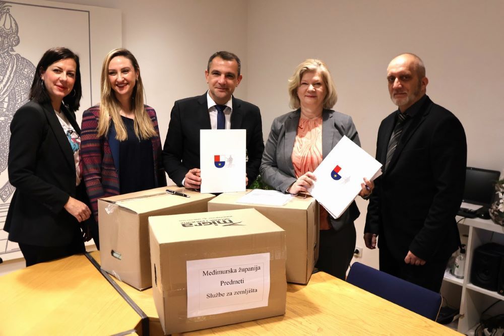 Državna tajnica u Ministarstvu prostornoga uređenja, graditeljstva i državne imovine Sanja Bošnjak u petak je predala županu Međimurske županije Matiji Posavcu predmete koji se odnose na zemljišta u vlasništvu Republike Hrvatske, odnosno zahtjeve za raspolaganjem tim zemljištem fizičkih i pravnih osoba. Sukladno novom Zakonu o upravljanju nekretninama i pokretninama u vlasništvu Republike Hrvatske, ti se predmeti predaju županijama i jedinicama lokalne samouprave na daljnje rješavanje. Župan je potpisao pripadajuću odluku, te naglasio da je ovaj korak značajan za naše građane, poduzeća i jedinice lokalne samouprave kojima će usluga biti dostupnija i brža: „Na snazi je novi zakon koji regulira raspolaganje nekretninama u vlasništvu Republike Hrvatske, a ovog trenutka Međimurska županija ima 301 predmet u Ministarstvu. U ovom trenutku, operativno preuzimamo prvih 99 predmeta, među kojima se 53 predmeta odnose na zahtjeve općina i gradova, a 46 predmeta na zahtjeve pravnih i fizičkih osoba“, pojasnio je župan Posavec, istaknuvši da je ovaj zadatak stručnim službama Međimurske županije izazov u smislu da i na tom planu želimo biti primjer dobre prakse u zemlji i pokazati koliko možemo biti ekspeditivni i učinkoviti.