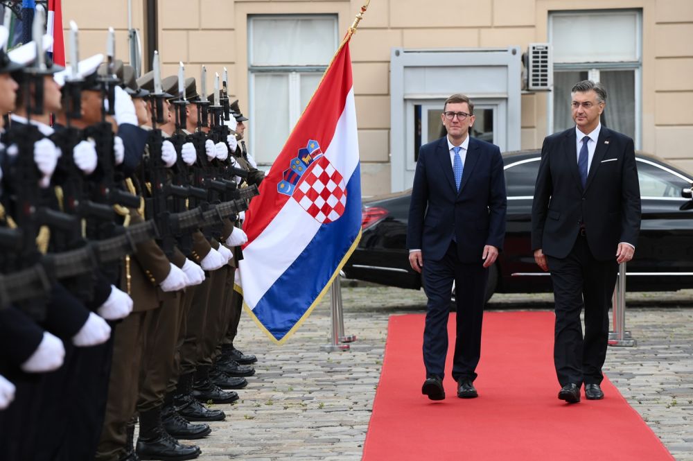Predsjednik Vlade RH Andrej Plenković sastao se danas s estonskim premijerom Kristenom Michalom, koji boravi u službenom posjetu Hrvatskoj. Nakon svečanog dočeka ispred Banskih dvora, dvojica premijera održali su bilateralni sastanak, a potom i sastanak izaslanstava. Na zajedničkoj konferenciji za medije izvijestili su o ključnim temama razgovora. Plenković je naglasio kako su odnosi Hrvatske i Estonije iznimno kvalitetni, uz usklađena vanjskopolitička stajališta, osobito na području sigurnosti. Oboje premijera složili su se da su članstvo u Europskoj uniji i NATO-u značajno pridonijeli razvoju i sigurnosti njihovih zemalja.