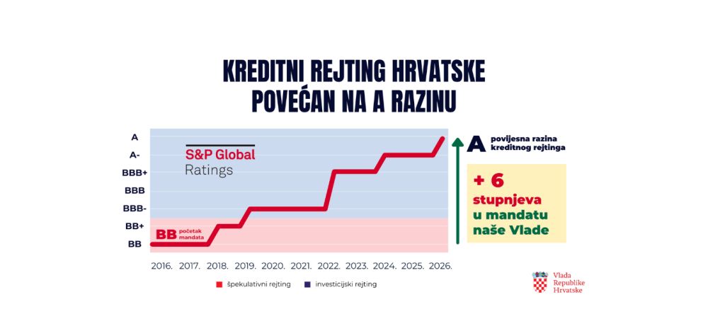 Podsjećamo da je prema S&P-u Hrvatska u ožujku 2019. godine prešla iz neinvesticijskog BB+ rejtinga u investicijski rejting BBB-, a danas smo dosegnuli razinu A. Hrvatska je jedina zemlja na svijetu koja je u tako kratkom vremenu (7 godina) ostvarila tako snažan skok po S&P-u (s neinvesticijskog rejtinga tj. razine BB+, na rejting razine A).